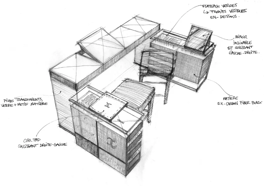 As merchandising and retail architecture has always to be innovative and is a never ending research, the CC brand had a strong need of new creations for makeup tables. Which involved Studio HOMEWeRK and CHANEL architecture development team in a three years collaboration. Some examples of designs below...
