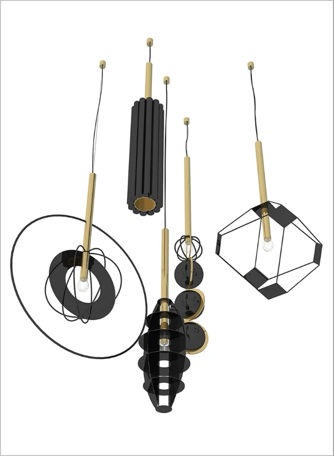 3D and 2D simulations, shiny brass and matt black painted steel.